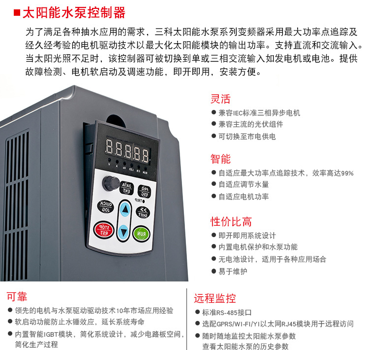 SK650系列變頻器是三科推出的針對(duì)光伏發(fā)電,驅(qū)動(dòng)三相交流水泵的變頻器,它采用大功率點(diǎn)追蹤及久經(jīng)考驗(yàn)的電機(jī)驅(qū)動(dòng)技術(shù)以催化增大太陽能模塊的輸出功率,它將直流電直接逆變成三相交流電,可驅(qū)動(dòng)各類交流水泵。同時(shí)它支持直流和交流輸入,當(dāng)沒有太陽能時(shí),該變頻器手動(dòng)切換到單項(xiàng)或三相交流電輸入,如市電發(fā)電機(jī)或電池。SK650光伏水泵變頻器提供全方位保護(hù),電機(jī)軟啟動(dòng)及調(diào)速功能,即開即用,安裝方便。| 產(chǎn)品型號(hào) | SKI650A045G-055G-4 | SKI650A055G-075G-4 |