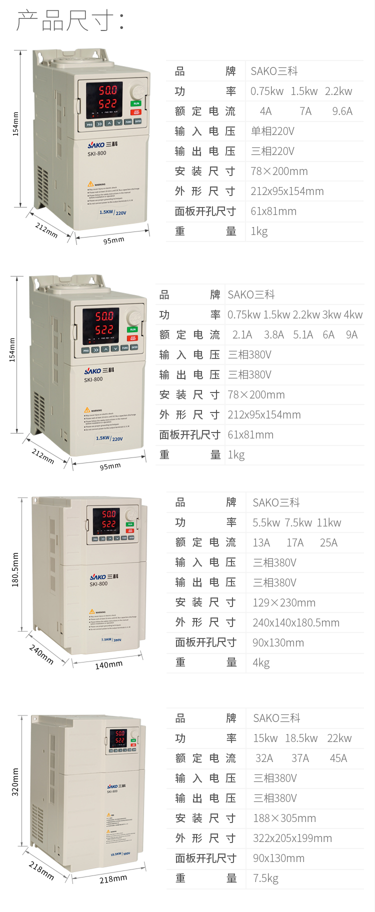三科變頻器技術(shù)領(lǐng)先,環(huán)保節(jié)能,可搭配變頻柜應(yīng)用在風(fēng)機(jī)、水泵、空壓機(jī)、注塑機(jī)、卷繞機(jī)、中央空調(diào),紡織機(jī)、化工、冶金、礦業(yè)、制藥、陶瓷、造紙、油田、塑料、印刷、熱電、煙草、食品等各類機(jī)械設(shè)備中。| 產(chǎn)品型號(hào) | SKI800A15D0G-4 | SKI800A18D5G-4 | SKI800A22D0G-4 |