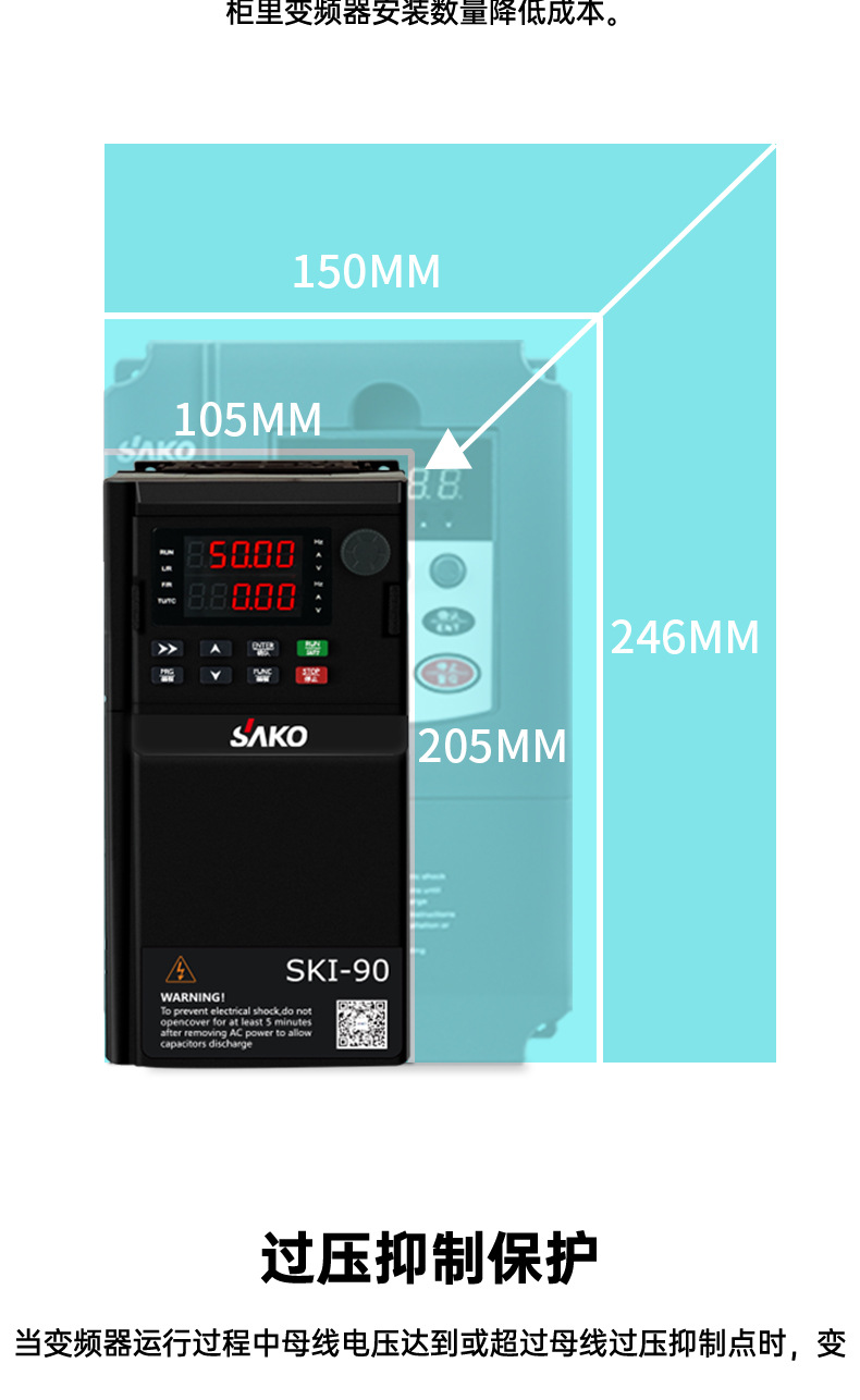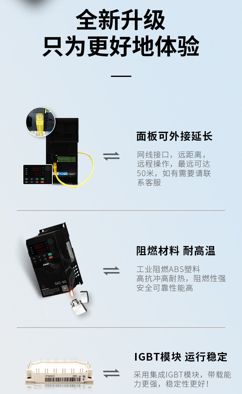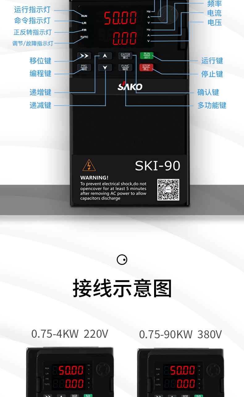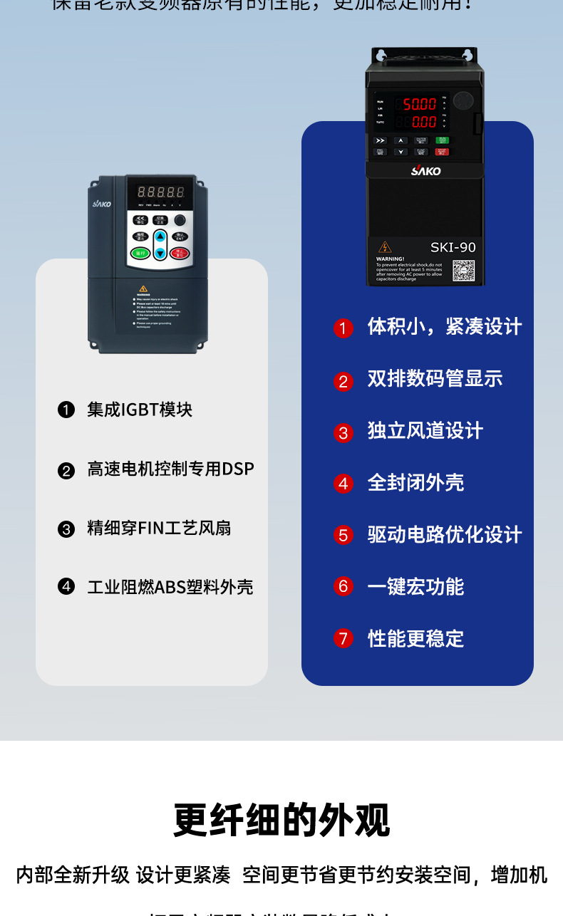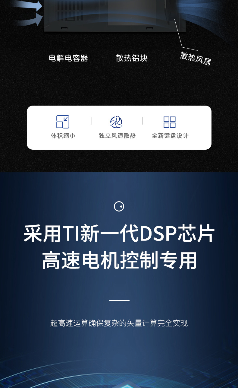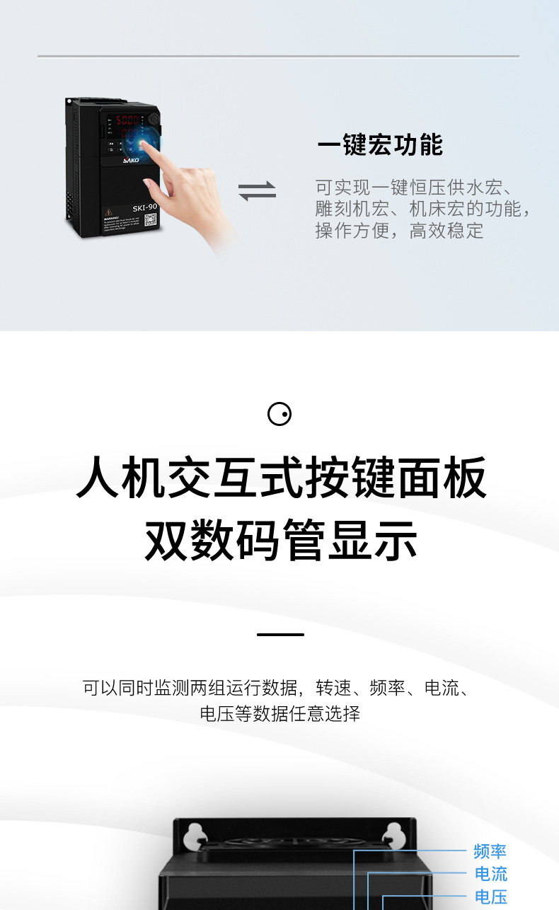 模塊機,體積小,功能強大,市面上超過98%的變頻器都可替換使用,纖細外觀,內(nèi)部全新升級,設(shè)計更緊湊,空間更節(jié)省更節(jié)約安裝空間,增加機柜里變頻器安裝數(shù)量,有效降低成本,雙排LED超清顯示,面板可外接延長。上下雙排都可顯示頻率,電壓,電流。