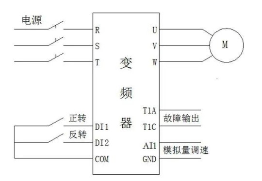 例如一個(gè)開關(guān)收到變頻器的正轉(zhuǎn)接線端子(一些是FWD,這兒是DI1),此刻變頻器會(huì)正轉(zhuǎn),開關(guān)自然要挑選維持式的,當(dāng)開關(guān)斷掉后,變頻器會(huì)立即終止。