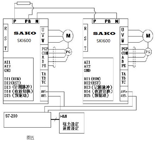 該卷染機的控制系統(tǒng)以三科變頻器作為控制器,采用觸摸屏作為人機界面,它們主要完成的是張力,線速度的設定,布的厚度的測量以及相關邏輯動作的控制。變頻器和PLC之間采用485通訊。采用通訊方式的好處是可以隨時知道變頻器主要變量的信息,減少接線,使得整個系統(tǒng)看起來很精簡。接線示意可見上圖。由圖中可見:兩臺完全一樣的變頻器,它們均工作于閉環(huán)矢量控制模式,由于卷染機在接近滿卷時候會較長時間工作在很低的頻率下(1~3Hz),采用較高線數的編碼器有助于提高在低轉速工況下的控制性能,同時考慮散熱,需要采用變頻專用電機。