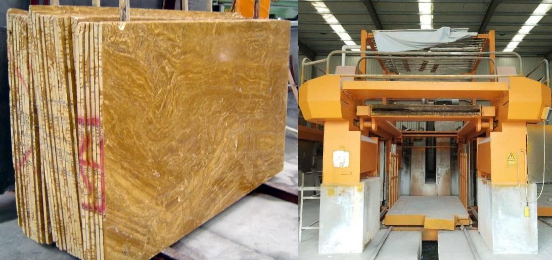 選用大型飛輪的大理石排鋸,既能夠提高運(yùn)行平穩(wěn)性,還能夠有效的儲(chǔ)存能量,最終達(dá)到節(jié)省電耗,達(dá)到節(jié)省成本效果目標(biāo)。整機(jī)切割方式,主電機(jī)驅(qū)動(dòng)飛輪,帶動(dòng)鋸框做直線往復(fù)運(yùn)動(dòng);裝載荒料的荒料車通過升降臺(tái)的提升實(shí)現(xiàn)荒料頂升式鋸切。加工荒料時(shí),鋸框保持往返運(yùn)動(dòng),裝載荒料的荒料車沿著有導(dǎo)向機(jī)構(gòu)上升,可大幅提高切割效果。