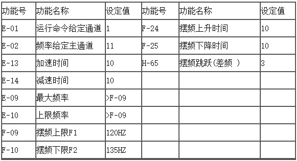 當(dāng)變頻器驅(qū)動(dòng)橫動(dòng)電機(jī)達(dá)到上限頻率f1或下限頻率f2時(shí),頻率應(yīng)突變,下降為或上升 ,突變頻率幅值一般為基本頻率F1 的1%左右,突變頻率的時(shí)間,理論上要求是0,但實(shí)際上,由于橫動(dòng)裝置和電機(jī)有慣性,使得電機(jī)速度不可能突變而有一過(guò)渡時(shí)間,過(guò)渡時(shí)間通常在0.1S以上。