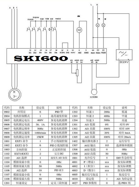 一,設(shè)計(jì)思路:選用一臺 15KW 具有 PID 功能的變頻器,可以不考慮輸入電抗器,電機(jī)速度由設(shè)定頻率與泵出口壓力作比較進(jìn)行 PID 調(diào)節(jié),設(shè)計(jì)應(yīng)考慮能手 /自動轉(zhuǎn)換。
