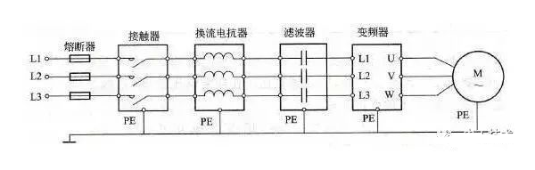 上圖是一副變頻器接線圖。在變頻器的安裝中,有一些問題是需要注意的。例如變頻器本身有較強的電磁干擾,會干擾一些設(shè)備的工作,因此我們可以在變頻器的輸出電纜上加上電纜套。又或變頻器或控制柜內(nèi)的控制線距離動力電纜至少100mm等等。