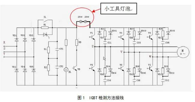 在具體運用中,電路這些一般為聯(lián)接接地銅排或快熔,把聯(lián)接獎牌和快熔除掉,將三相逆變電源IGBT正開關電源與直流電儲能技術電容器中間斷掉,把電燈泡接在兩點之間就可以。IGBT檢驗方式布線如圖所示1所顯示。