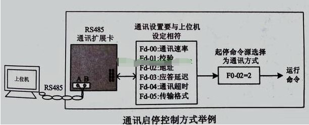 在VFD多功能擴展口上,插入相應的通信接口卡,選擇控制命令源作為通信模式(F0-02=2),這樣就可以通過通信模式控制VFD的啟動和停止。通信相關(guān)功能代碼的設(shè)置如下圖所示。