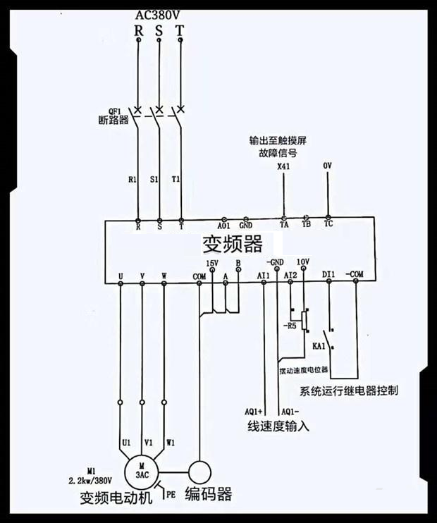 上圖高性能矢量型變頻器的在實際電路中的應(yīng)用電路圖。上圖中變頻器所驅(qū)動的電動機,在電動機軸上附加了一個編碼器來與電動機同步旋轉(zhuǎn),編碼器此時可以根據(jù)電機的速度隨時隨地采集它的動態(tài)速度的情況,及時反饋給變頻器的PG卡。