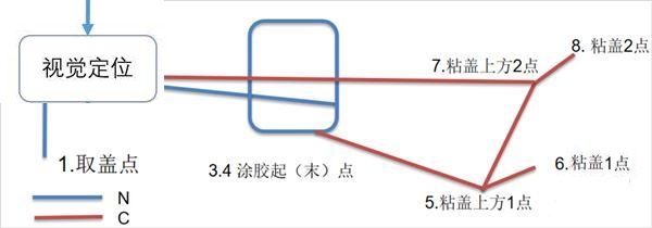 8)回到取蓋上方點,等待進(jìn)入粘蓋下一次循環(huán)。