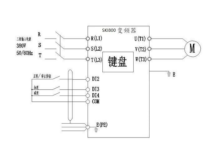 根據(jù)牽引電機(jī)工作原理,利用紅外線開關(guān)控制牽引電機(jī)速度,紅外開關(guān)通牽引減速,反之加速;根據(jù)工況,采用普傳科技SKI800變頻器控制牽引電機(jī),變頻器采用端子臺控制、頻率源主設(shè)為鍵盤電位器給定,頻率源敷設(shè)為鍵盤設(shè)定頻率UP/DOWN可修改,掉電不記憶;頻率源疊加選擇為個(gè)位:主輔運(yùn)算結(jié)果,十位:主+輔;紅外開關(guān)常閉接DI3和COM,常開接DI4和COM;原理圖如下: