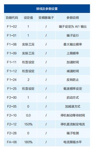在大圓機(jī)運(yùn)轉(zhuǎn)中,絕對(duì)不能讓電機(jī)反轉(zhuǎn)以及回轉(zhuǎn)現(xiàn)象,否則針床的針將被折彎甚至斷針。有些大圓機(jī)接入單向軸承,可不予考慮。要是系統(tǒng)正反轉(zhuǎn)完全取決于電機(jī)的正反轉(zhuǎn)控制,則需要設(shè)置合理的參數(shù),一方面要設(shè)置禁止反轉(zhuǎn)功能,另外一方面需要直流制動(dòng)功能。還要注意不能出現(xiàn)失速現(xiàn)象,以免造成斷針等損失。本方案采用模擬量輸入給定頻率。線路簡單(省略)大圓機(jī)要求起動(dòng)時(shí)響應(yīng)要快,低頻大轉(zhuǎn)矩輸出;停機(jī)時(shí)要光滑、柔和一些,以保護(hù)針床。因此合理設(shè)置上表參數(shù)是充分發(fā)揮圓機(jī)性能的保證,原則是通過調(diào)節(jié)F1-13參數(shù)得到最佳的低頻轉(zhuǎn)矩輸出能力以及降低圓機(jī)高速運(yùn)行的振動(dòng),通過調(diào)起停控制(F2組)以及加減速度時(shí)間參數(shù)(F1組)得到頻率調(diào)節(jié)的光滑性。