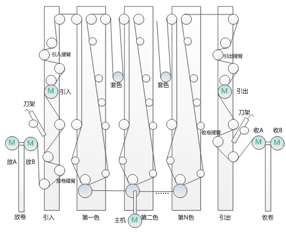 作為如今凹版印刷行業(yè)中較為普遍的控制系統(tǒng),七電機(jī)張力控制方案的系統(tǒng)構(gòu)成是由七臺(tái)電機(jī)進(jìn)行變頻傳動(dòng)控制,其中兩臺(tái)分別負(fù)責(zé)放卷、兩臺(tái)負(fù)責(zé)收卷、最后由一臺(tái)主機(jī)負(fù)責(zé)控制收、放卷牽引各一臺(tái)構(gòu)成,其中收卷、放卷、收放卷牽引都是帶張力反饋的閉環(huán)張力控制,當(dāng)VFD以速度模式運(yùn)行時(shí);由于印刷單元在兩級(jí)牽引的中間,對(duì)套色精度有較高的標(biāo)準(zhǔn),因此穩(wěn)定性對(duì)張力調(diào)節(jié)來(lái)說(shuō)十分重要,所以主機(jī)和兩級(jí)牽引采用帶編碼器的閉環(huán)矢量控制。其他張力控制系統(tǒng)均是在七電機(jī)張力控制系統(tǒng)的基礎(chǔ)上進(jìn)行增加或減少電機(jī)構(gòu)成的。