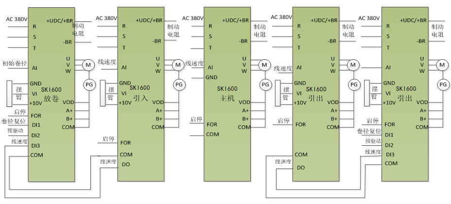 SKI600將卷徑計(jì)算、預(yù)驅(qū)動(dòng)、張力控制、速度同步調(diào)節(jié)(輔助頻率)、收放卷切換等功能進(jìn)行了整合集成,該系統(tǒng)中的PLC只需將相應(yīng)功能的信號(hào)給到印刷機(jī)變頻器即可。凹版印刷機(jī)在使用中會(huì)使用不同大小的印版,需要PLC處理印版大小不同時(shí)同步頻率,再以此為基礎(chǔ)確認(rèn)引入和引出的同步頻率(主頻率),引入和引出變頻器再根據(jù)擺臂反饋回來(lái)的信號(hào)由PID自動(dòng)計(jì)算出一個(gè)頻率(輔助頻率),二者相加,實(shí)現(xiàn)牽引的同步控制。通過(guò)牽引將運(yùn)行頻率傳導(dǎo)至收卷和放卷做線速度信號(hào),這里初始卷徑是由PLC給定的,線速度與初始卷徑相結(jié)合就得出了收放卷VFD的主頻率,同時(shí)根據(jù)擺臂反饋回來(lái)的信號(hào)通過(guò)PID的自動(dòng)計(jì)算功能給出相應(yīng)的頻率(輔助頻率),當(dāng)二者相加時(shí),既看完成收放卷的橫張力控制。由于負(fù)責(zé)控制主機(jī)、牽引和收放卷部分的VFD是采用了速度閉環(huán)模式,這樣確保了控制的精度;