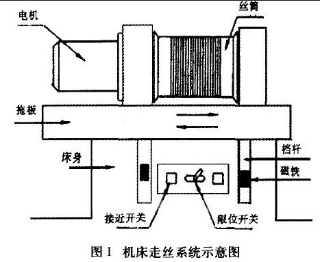高速線(xiàn)切割機(jī)走絲機(jī)構(gòu)是影響其加工質(zhì)量和加工穩(wěn)定性的關(guān)鍵部件。送絲機(jī)構(gòu)的作用是驅(qū)動(dòng)電極絲以一定的線(xiàn)速度前后移動(dòng),將電極絲整齊地排列在儲(chǔ)線(xiàn)筒上。儲(chǔ)線(xiàn)筒本身的高速正反轉(zhuǎn)是通過(guò)電機(jī)的正反轉(zhuǎn)來(lái)實(shí)現(xiàn)的。電機(jī)通過(guò)聯(lián)軸器帶動(dòng)螺桿筒,再通過(guò)同步帶帶動(dòng)螺桿轉(zhuǎn)動(dòng),使滑架往復(fù)運(yùn)動(dòng),通過(guò)調(diào)節(jié)換向左右保險(xiǎn)杠之間的距離,即可實(shí)現(xiàn)滑架的移動(dòng)行程。機(jī)床的送絲機(jī)構(gòu)如下所示。