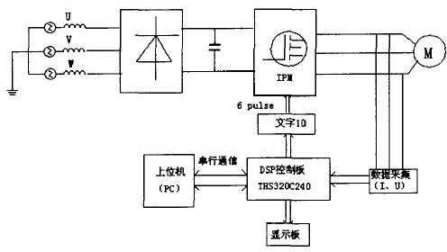 采用數(shù)字信號(hào)處理器作為控制器,可以減少外圍設(shè)備的數(shù)量,提高系統(tǒng)的穩(wěn)定性。在本設(shè)計(jì)中,主要使用了1MS32OC24Ox DSP的PWM輸出端口、板載A/D端口和捕獲接口CAP。DSP的六路PWM信號(hào)經(jīng)緩沖器反相后送到驅(qū)動(dòng)電路板驅(qū)動(dòng)IPM??刂葡到y(tǒng)結(jié)構(gòu)圖下所示。