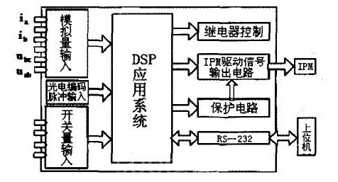 設(shè)計(jì)中采用了IGBT智能電源模塊。它是一個(gè)大規(guī)模集成模塊,不僅集成了功率開(kāi)關(guān)器件和驅(qū)動(dòng)電路,還包括過(guò)壓、過(guò)流、過(guò)熱等故障檢測(cè)電路,可以將故障保護(hù)信號(hào)發(fā)送給CPU或DSP進(jìn)行處理。