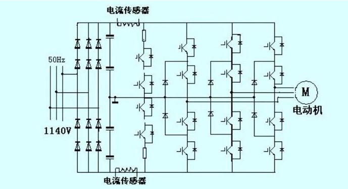 (3)更換保險絲后,機柜正常上電,工頻啟動并正常工作,工頻維修結(jié)束。然后維修變頻部分。主電路如圖1所示。