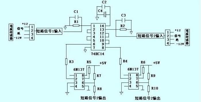(5)檢查短路保護板。拔下輸入短路保護采樣電流傳感器,測量板上電源電壓,12v正常,但+5v電源電壓+3.0v,將集成塊拔成74hc14,+5v正常,說明集成塊已經(jīng)損壞。用新的替換它。