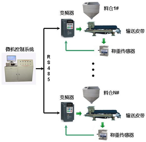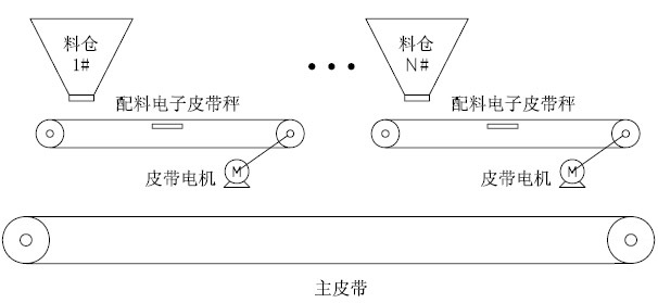 其主要工作流程是:料倉打開后,物料落入相應(yīng)的皮帶上,皮帶電機拖動皮帶轉(zhuǎn)動,則物料被連續(xù)拉出,皮帶電機的轉(zhuǎn)速就決定了物料的流量。每個皮帶下面有一自動稱重皮帶秤,通過皮帶秤就可以稱出下料的流量、累積量等數(shù)據(jù)。所有皮帶的下面是一輸送主皮帶,主要作用是把混合好的原料送到下級容器中。