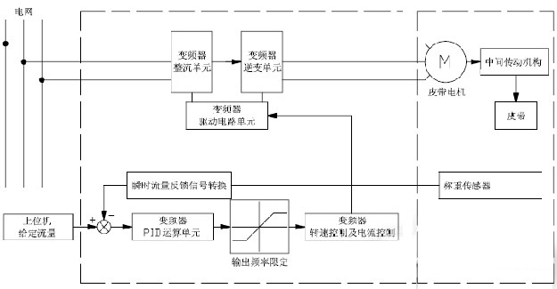 過流量設(shè)定及反饋,調(diào)節(jié)SKI600的輸出頻率以控制輸送皮帶的轉(zhuǎn)速,自動實現(xiàn)給料流程的精確控制和給料總量的準確計量。SKI600流量PID閉環(huán)調(diào)節(jié)結(jié)構(gòu)圖如圖3 所示。