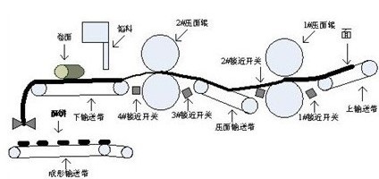 通過兩個(gè)壓面輪和一個(gè)護(hù)面裝置將面團(tuán)搟拉,使面團(tuán)更有光澤,質(zhì)量更穩(wěn)定。每個(gè)壓面輪都有一個(gè)厚度調(diào)節(jié)裝置來設(shè)定面團(tuán)的厚度,以增加或減少產(chǎn)品的重量。壓面輪與稀化裝置之間的速度由接近開關(guān)控制,不會(huì)因主機(jī)輸送速度過快而使面團(tuán)破碎或堵塞;經(jīng)過最后一個(gè)主機(jī)壓面輪后,面團(tuán)會(huì)落在主機(jī)傳送帶上,由餡料部分加入餡料,然后由收卷輪和副收卷輪將面團(tuán)搟成條狀;最后,通過夾捏成型機(jī)成型后,可以通過成型機(jī)設(shè)置切割長度,以確定產(chǎn)品的長度和重量。整個(gè)處理過程如下所示。