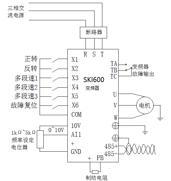 該現(xiàn)場(chǎng)采用易能PLC、SKI600-VFD和SK-MD204觸摸屏。PLC控制系統(tǒng)與人機(jī)界面之間采用標(biāo)準(zhǔn)的modbus通訊協(xié)議,準(zhǔn)確讀取變頻器的狀態(tài)信息??刂葡到y(tǒng)與變頻器之間采用多段速的控制方式,方便客戶準(zhǔn)確選擇不同的線體速度。