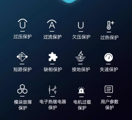 具備過壓、過流、欠壓、過熱、短路、缺相、接地、失速等全方位保護功能。