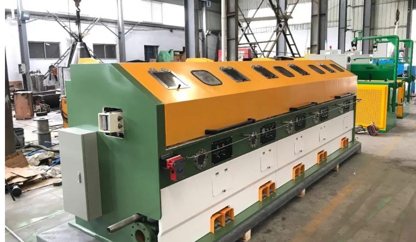水箱式拉絲機是由多個拉拔頭組成的小型連續(xù)生產(chǎn)設(shè)備,通過逐級拉拔,并將拉拔頭置于水箱中,最后將鋼絲拉到所需的規(guī)格。就國內(nèi)幾個主要水箱式拉絲機生產(chǎn)商來看,一般配置了20個左右的拉拔頭。通過每一級的拉拔后,鋼絲的線徑發(fā)生了變化,所以每個拉拔頭工作線速度也應(yīng)有變化。在整個拉拔過程中,只需要1臺電動機通過機械傳動或齒輪箱來驅(qū)動。根據(jù)拉模配置的不同,各個拉拔頭的拉拔速度也要變化。拉拔速度的基準(zhǔn)是每個時刻通過拉模的鋼絲的秒流量體積不變,即要使下式成立