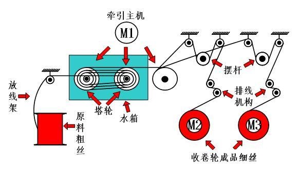 水箱式拉絲機的各個拉拔頭的工作速度就是基于以上的公式,保證各個拉拔頭同步運行。由于水箱式拉絲機的拉絲過程完全通過機械軸拉拔完成,并且這些機械軸是在同一主軸下傳動的,因此整個拉伸系統(tǒng)各級之間依靠拉伸輪的轉(zhuǎn)速差別和線上張力來控制同步協(xié)調(diào)工作。工作時需要冷卻液進行散熱。收線部分用1臺小功率電動機拖動,需要保持收卷時線上張力保持恒定,若這一段張力波動,收卷的工字輪上的繞線將會不均勻。水箱式拉絲機的收卷環(huán)節(jié)是此設(shè)備控制系統(tǒng)中的核心環(huán)節(jié),該環(huán)節(jié)也直接影響著鋼絲的質(zhì)量。