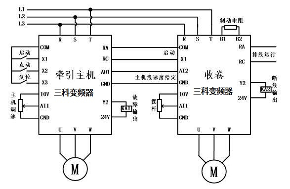 分別在牽引電機與收卷電機上應(yīng)用4級、2.2~7.5KW中使用三臺變頻器