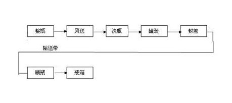 生產(chǎn)線共使用17臺(tái)變頻調(diào)速器,每小時(shí)產(chǎn)量15000瓶,分別用于風(fēng)力輸送、傳送帶輸送、洗瓶、裝罐、壓蓋。流程圖各部分的主要功能和工藝流程如下: